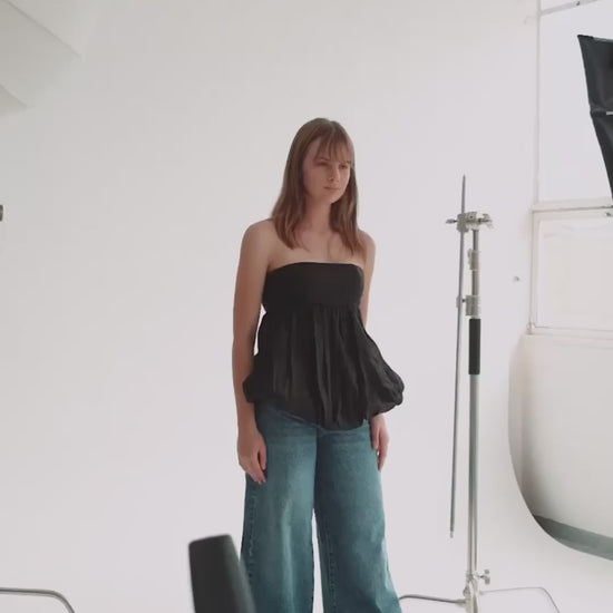 An effortless strapless statement top crafted from 100% breathable Ramie with a natural sheen. The structured bandeau neckline is balanced by a gathered balloon hem, adding modern volume and softness.