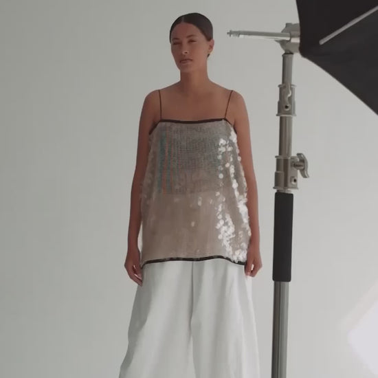 Light-catching and fluid, The Gaia Top is made from a European open-mesh cotton embroidered with mermaid-style sequins, delicate translucent discs that move and shimmer with ease. The A-line cut and spaghetti straps offer a softly structured shape, finished with contrast binding for a clean line.