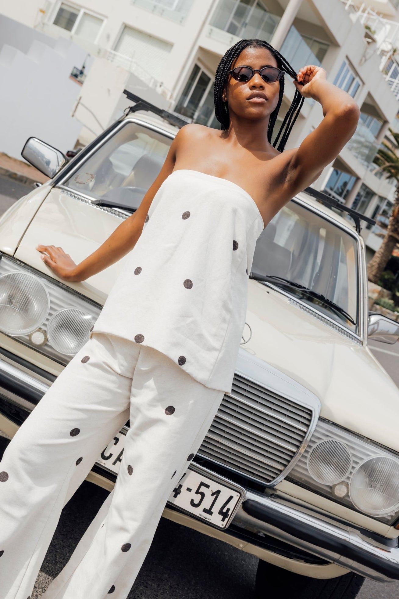 The bold polka dot print adds playful contrast to the minimalist silhouette, and with polka dots trending hard this season, this one’s a standout. Wear as a set, or mix and match with your summer staples.