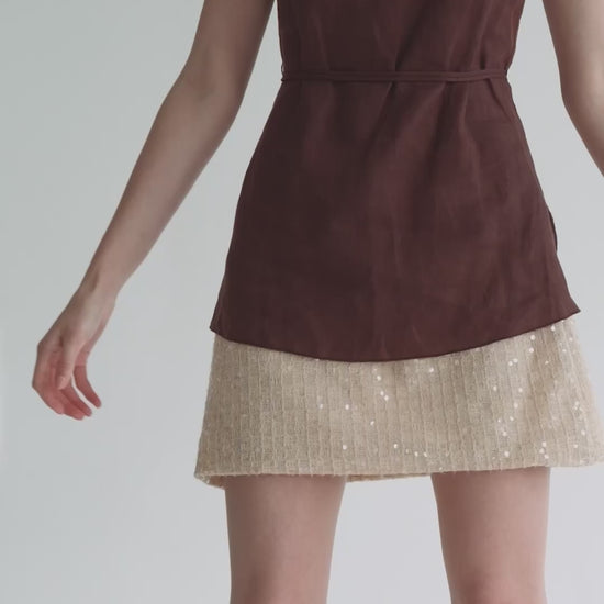 A compact burst of texture and shine. The Lucent Mini Skirt is crafted from open-weave 100% cotton, intricately embroidered with tonal champagne sequins for a soft, glistening finish. The tactile surface and quiet shimmer give it the richness of a collectible piece.