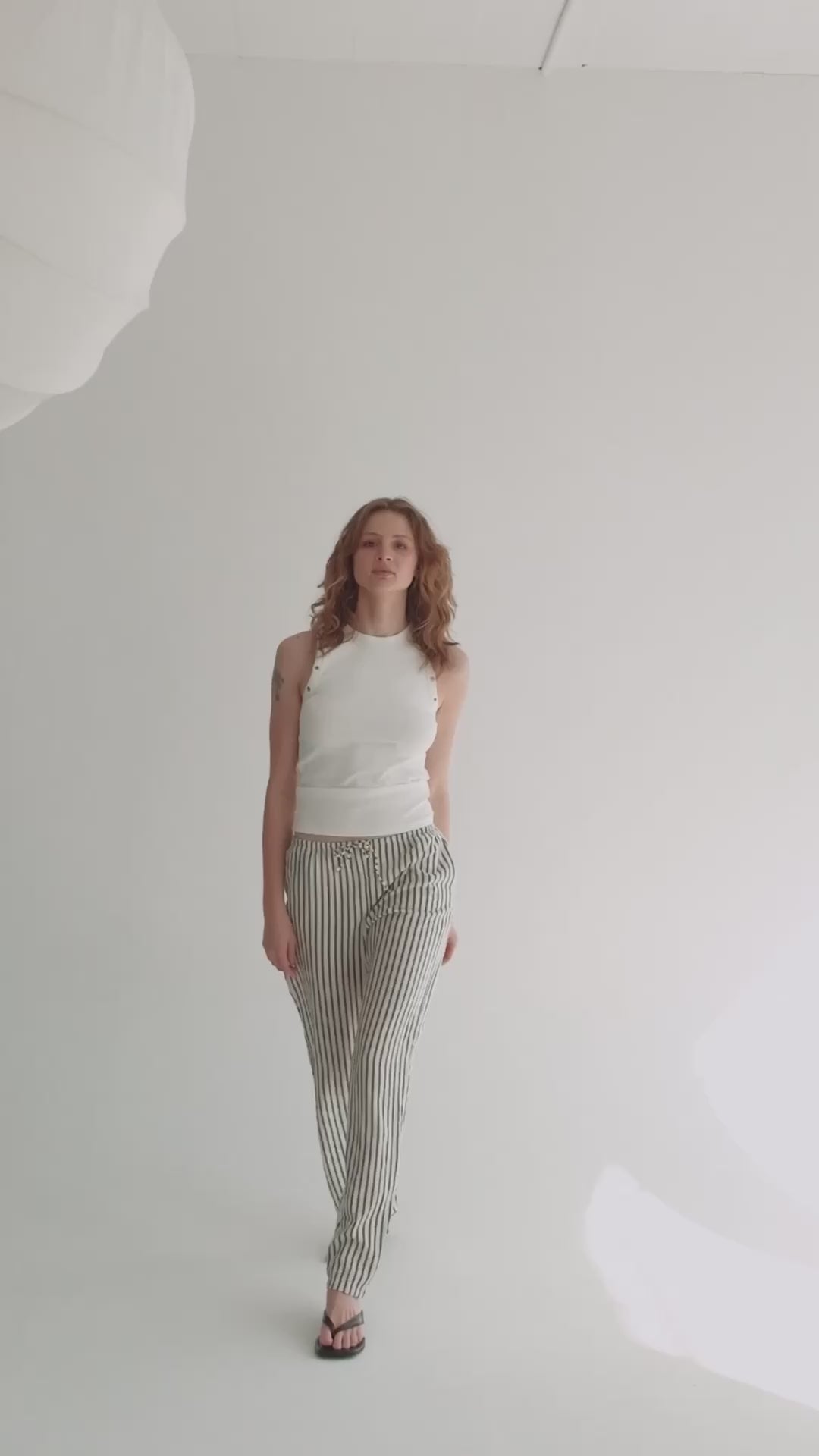 Inspired by coastal living, the Marina Pant is your go-to for sun-drenched days. Made from 100% breathable cotton, it features a wide-leg cut, drawstring waist, and vertical salt-and-sea green stripes.
